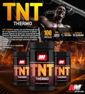 TNT THERMO Cuenta con una fórmula de más de 15 ingredientes que promueve la termogénesis (quema de grasa por aumento de temperatura, lipotropismo, potencializa la quema de grasa por movimiento) evita la retención de líquidos y brinda energía extrema a nuestro cuerpo.
